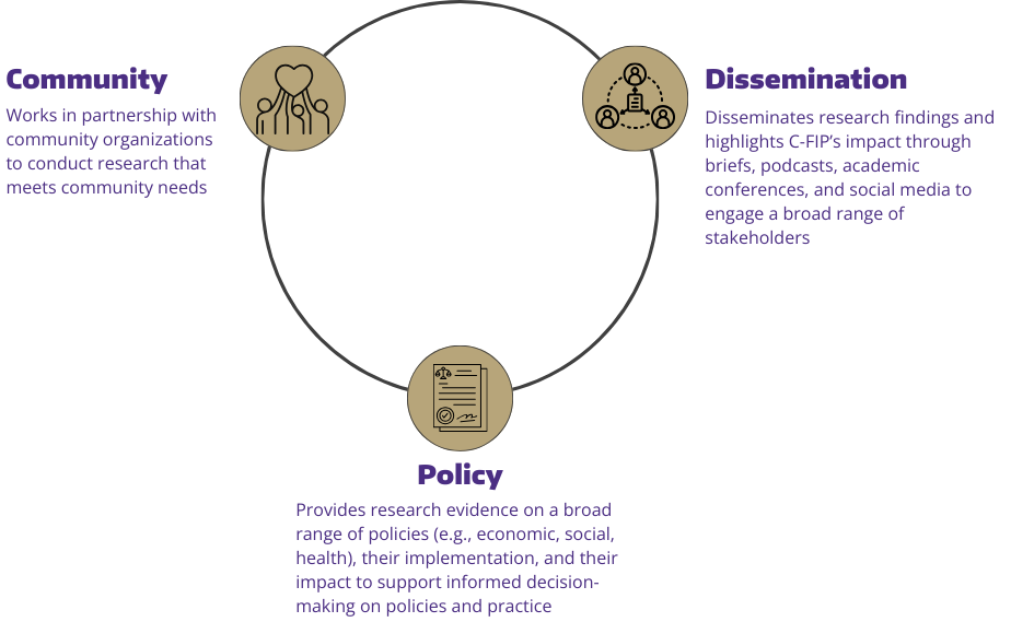 The Center for Firearm Injury Prevention operates with three cores: Community, Dissemination, and Policy. Each team is guided by one Director and focuses on specific initiatives in their area. Core Directors meet regularly to discuss priorities, plan objectives, and ensure cohesive progress across all teams while remaining aligned with the C-FIP vision, mission, and values.