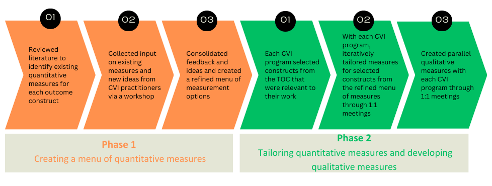 Evaluation measures were developed through a two-phase, collaborative process (see figure below). In Phase 1, the academic team curated a menu of quantitative measures (i.e., survey questions) by integrating existing literature with insights and new ideas from CVI practitioners. In Phase 2, each CVI program involved in the project selected constructs from the TOC that were relevant to their work and collaborated with the academic team in 1:1 meetings to tailor measures for those constructs (from the menu created in Phase 1) to their program and service population — ensuring clarity, relevance, and alignment with program needs. Qualitative measures (i.e., interview guides) were co-developed in parallel to complement the survey questions. This online toolkit draws from the inventory of the finalized, tailored measures.