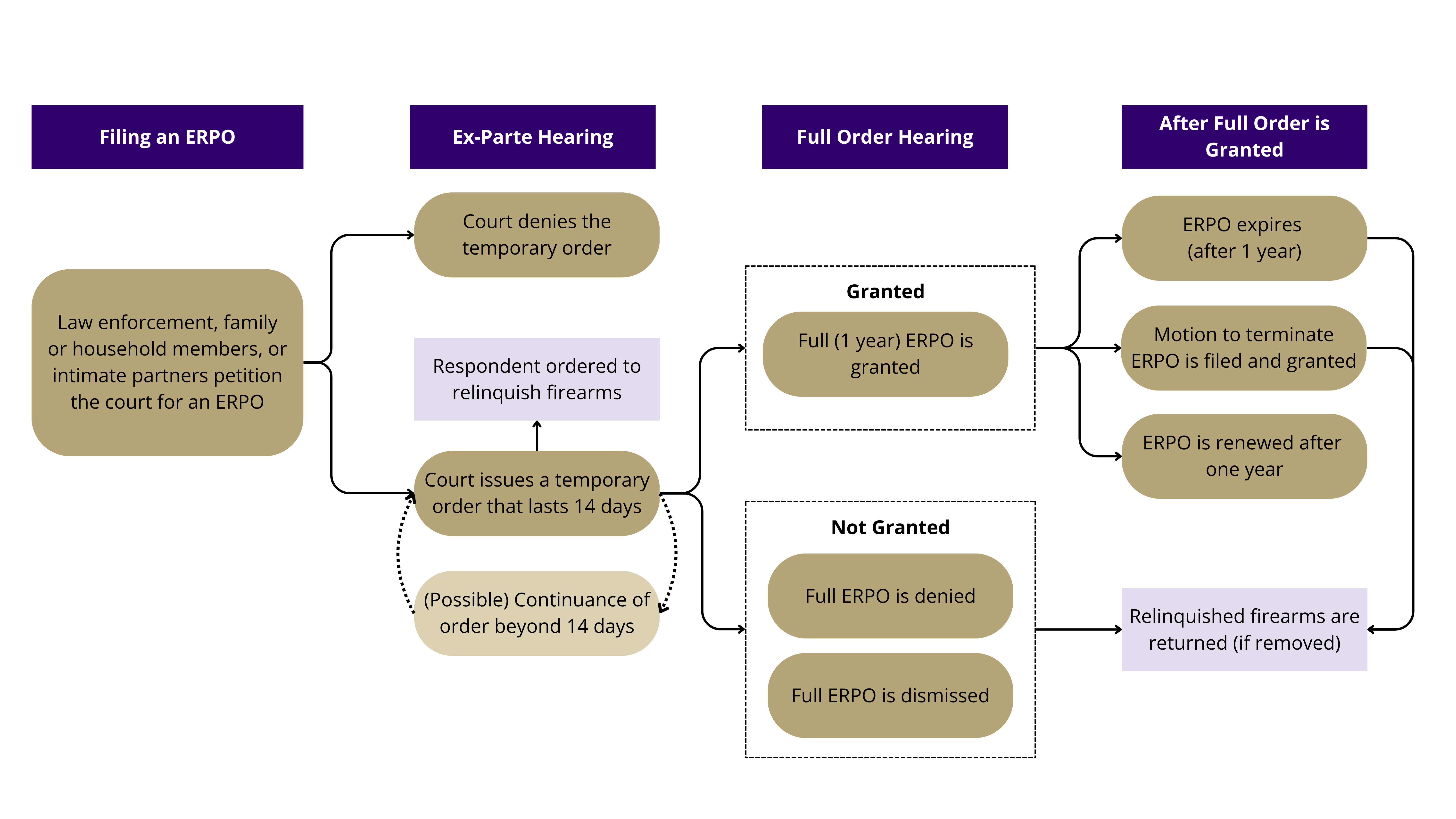 4. The full hearing occurs at least two weeks after the temporary order is granted. If the petitioner does not appear at the hearing, the ERPO will be dismissed. If the petitioner appears at the hearing, the judge will decide whether the ERPO will be granted or denied. If an ERPO is denied or dismissed, the respondent’s firearms are returned to them.